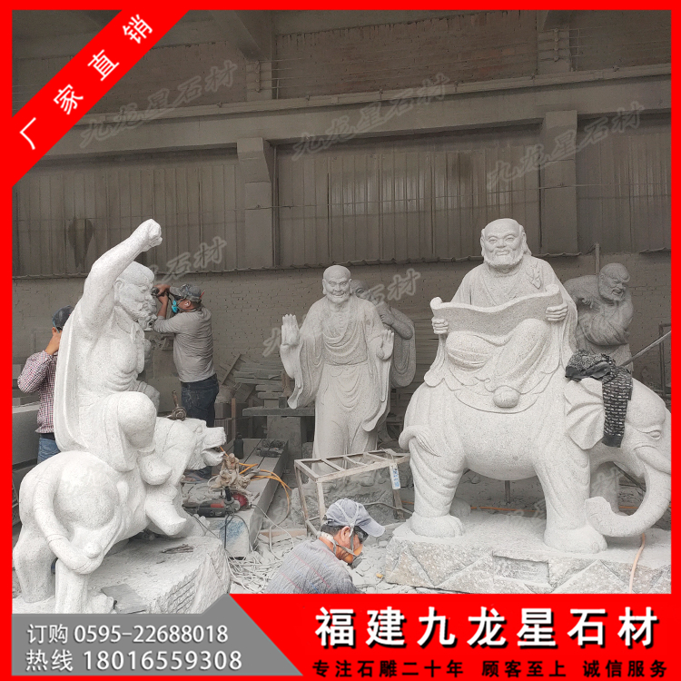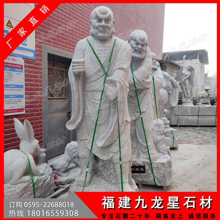 看著每一尊寺院十八羅漢石像,不得不感嘆古人的智慧啊。這些被珍藏的十八羅漢塑像,保存的如此完好,這還是要?dú)w功于,十八羅漢塑像是采用的天然石材手工雕刻而成,純天然的石頭在大自然中被人們開鑿來制作成十八羅漢石像作品,這樣的一整套十八羅漢作品,不僅帶著天地精華,也將人們的智慧和工藝賦予其中,石刻十八羅漢就是最好的安排了吧。古代十八羅漢帶有歷史沉淀的韻味,具有很高的研究價(jià)值。而現(xiàn)代十八羅漢雕刻為了能有這樣的一份感情,開始了對石雕18羅漢仿古做舊的技術(shù),也更符合一些古建筑,古剎寺院去擺放仿古代石雕十八羅漢擺件。