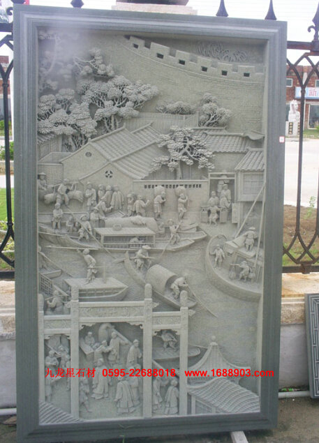 3、 沉雕。又稱(chēng)"線(xiàn)雕",即采用"水磨沉花"雕法的藝術(shù)品。此類(lèi)雕法吸收中國(guó)畫(huà)與意、重疊、線(xiàn)條造型散點(diǎn)透視等傳統(tǒng)筆法,石料經(jīng)平面加工拋光后,描摹圖案文字,然后依圖刻上線(xiàn)條,以線(xiàn)條粗細(xì)深淺程度,利用陰影體現(xiàn)立體感。此類(lèi)產(chǎn)品多數(shù)用于建筑物的外壁表面裝飾,有較強(qiáng)的藝術(shù)性。