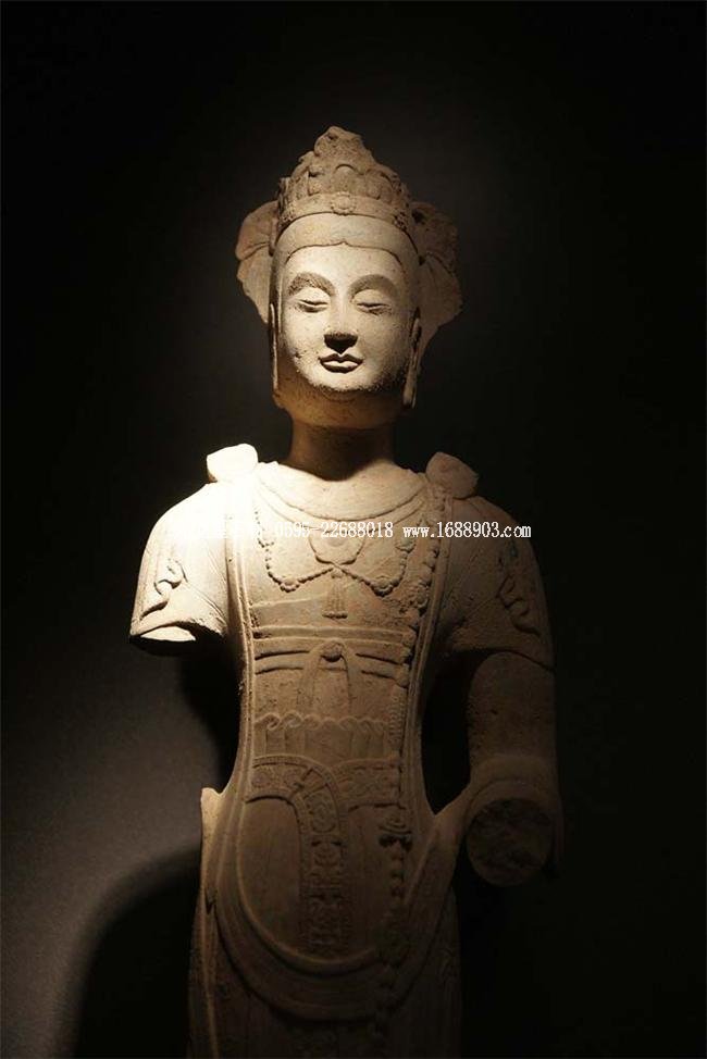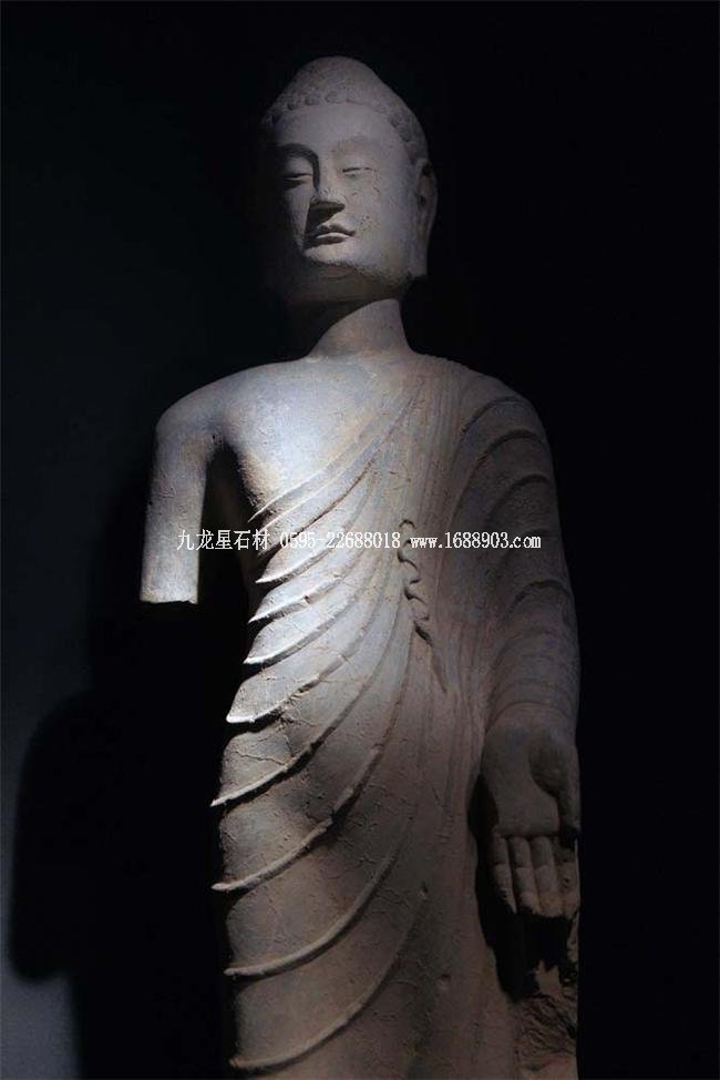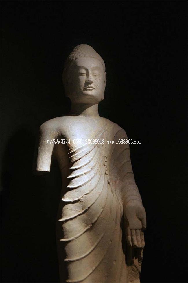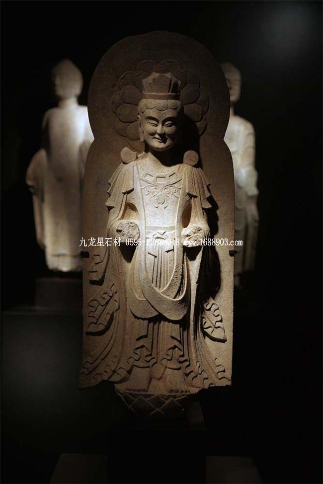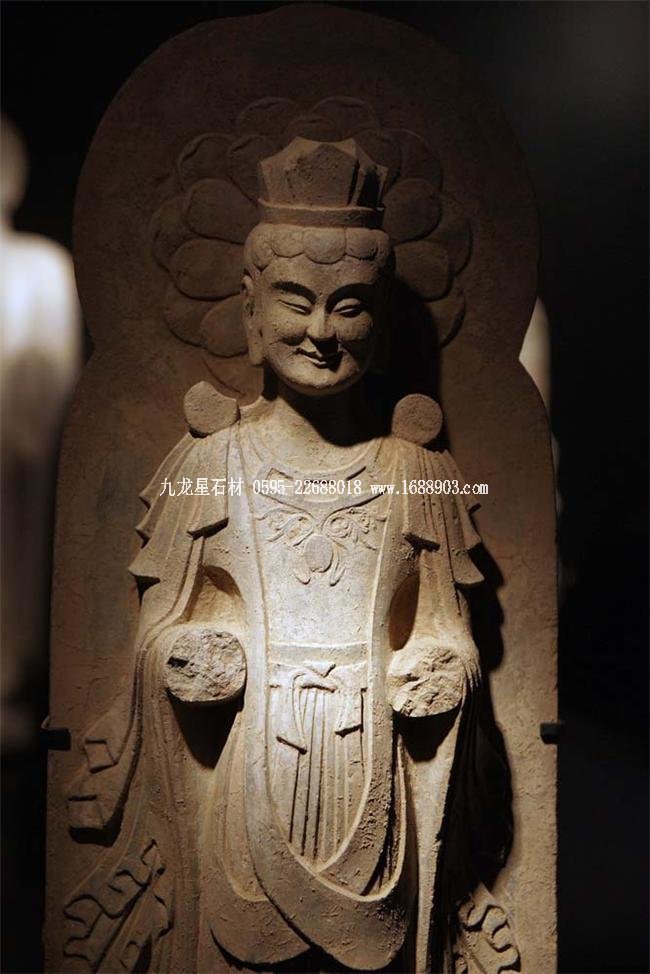 北魏、北齊時(shí)期,佛像雕刻藝術(shù)趨于巔峰極致之境界。北魏佛像造型挺拔秀美,細(xì)腰寬背,衣紋是富于裝飾的淺刻。北齊造像多為面型豐腴,衣紋簡(jiǎn)潔,服薄貼體,整體平潤(rùn)光潔,與面部寧?kù)o安祥的表情和諧一致。這類(lèi)疏簡(jiǎn)淳潤(rùn)的佛像造像,無(wú)論從光潔的肌體或平滑衣物里,似乎都能感覺(jué)到內(nèi)部筋肉的輕微變化。潤(rùn)澤的體面與舒緩下垂的線(xiàn)條,使形象在疏簡(jiǎn)平淡中流露出內(nèi)在的氣質(zhì)。