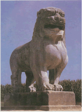 南北朝時期,墓前雕像有所恢復(fù),一般都在墓前設(shè)置一對或多對石獸。這種悖常為“神獸”的想象中動物形象,被成為“麒麟”,有的似獅虎,卻右翼,被稱為“避邪”。這種石雕一般都比較龐大,姿態(tài)宏偉,整體感較強(qiáng),又較為濃厚的漢代遺風(fēng)。現(xiàn)存遺跡多為南北朝時作品,江蘇南京周邊比較多見。其中最為杰出的是江蘇句容石獅村梁南康簡王蕭績墓前的石雕群,造型簡潔,體積感強(qiáng),最能代表當(dāng)時的藝術(shù)風(fēng)格。