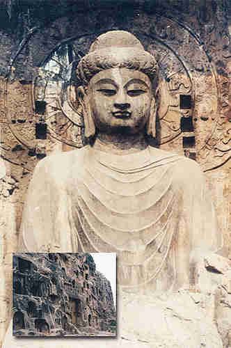 河南洛陽城南的龍門石窟,力經(jīng)東魏、北齊、隋、唐多個朝代之開鑿,作品龐雜,遺留作品也較多??上У氖?解放前被外國列強(qiáng)盜去了許多造像以及頭、手臂等局部,造成了無法挽回的損失。賓陽中洞是龍門石窟中比較重要的一處,是北朝時期有史實(shí)可查的,其形制結(jié)構(gòu)與云岡曇曜五窟相似,窟內(nèi)飾有蓮花、飛天、云氣等圖案,氣氛神秘、紋飾華麗,但無瑣碎之感;蓮花洞內(nèi)的石雕蓮花特別突出,窟內(nèi)主佛像為站立姿勢,手臂的雕刻尤為動人,,似有柔軟彈性之感;古陽洞是龍門石窟中較大的一個,歷史年代也較早,最有代表性的是在洞內(nèi)壁面上雕滿了小佛龕,幾乎每龕都有造像題記,中國著名的書法碑帖“龍門二十品”中,古陽洞中的就有十九品。