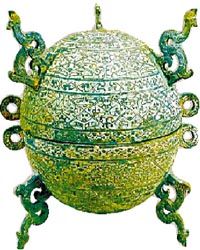 西漢的工藝裝飾性雕塑也十分發(fā)達(dá),其一為銅鏡裝飾。這一時期除了與前代大體相同的云雷紋、蟠龍紋以外,比較流行使用吉祥語,如“長相思、毋相忘、常富貴、樂未央”等等;乳釘紋也是這一時期的特點(diǎn),在乳釘之間有人物、鳥獸等等。其二,西漢的金銀嵌鑲工藝也比較發(fā)達(dá)。是在銅制器物上嵌鑲金、因、松石等不同材質(zhì)的裝飾,在填以黑漆,曰“錯金銀”。最有代表性的一件作品為“錯金銀”博山爐,雖微熏香用的實(shí)用品,但其爐蓋雕制成層次重疊的造型,這在漢代也十分盛行。