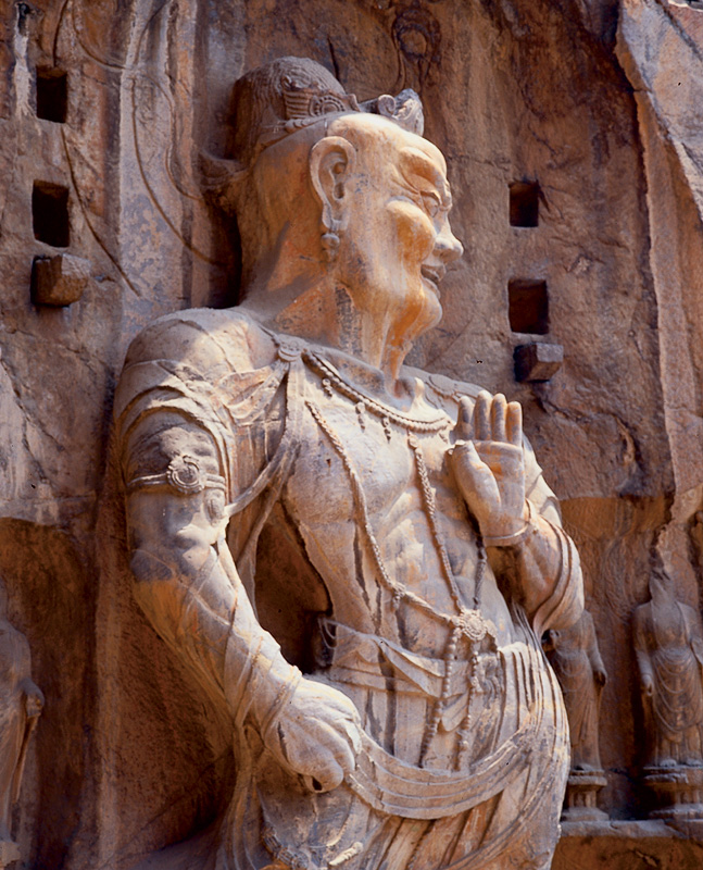 傳神是中國藝術(shù)的最高審美要求。面部表情是最能表現(xiàn)人的思想感情的,佛的莊嚴(yán)、觀音的慈祥、憤怒的天王、騾悍的力士都要通過人的眼神、嘴唇的微妙變化傳達出來,當(dāng)然,眼睛離不開五官的諧和,神態(tài)也離不開身姿手勢的表征。除個體形象本身的傳神之外,傳神還表現(xiàn)在人物關(guān)系之間及巨幅造像的整體意境中。