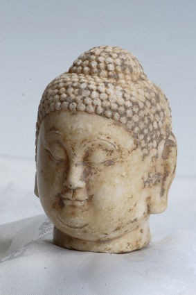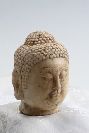 佛造像是佛教的載體,通過對(duì)佛造像年代、工藝、造型及風(fēng)格的研究,有助于認(rèn)識(shí)和了解古代雕刻藝術(shù)、文化史,古人的審美情趣以及古代的政治、經(jīng)濟(jì)和科技發(fā)展水平。縱觀佛造像制作材料,有木制、泥塑制、金屬制、牙骨制、陶瓷制和石制。其中以石刻雕制的難度最大,因?yàn)樗婕笆系倪x擇、開采、運(yùn)輸,體大量重,雕刻打磨實(shí)屬不易。唐代石刻佛造像是把人與精神、現(xiàn)實(shí)與理想完美地結(jié)合在一起的最佳表現(xiàn)形式。那么就請(qǐng)大家一同欣賞這尊唐代漢白玉佛首的神韻和藝術(shù)感染力以及由此帶給我們大家的宗教、歷史、文化等方面的信息吧。