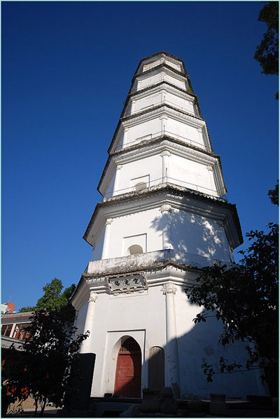 福州白塔又名報恩定光多寶塔,位于福州市鼓樓區(qū)南門萬歲寺后。福建省文物保護(hù)單位。塔高7層,塔身8面,內(nèi)以磚砌,外用木構(gòu),頂有相輪塔剎,塔壁及門面繪有金佛像。1962年維修時,又在塔的周圍出土青石浮雕塔座15方,在原位豎立,以保存文物并供觀賞。