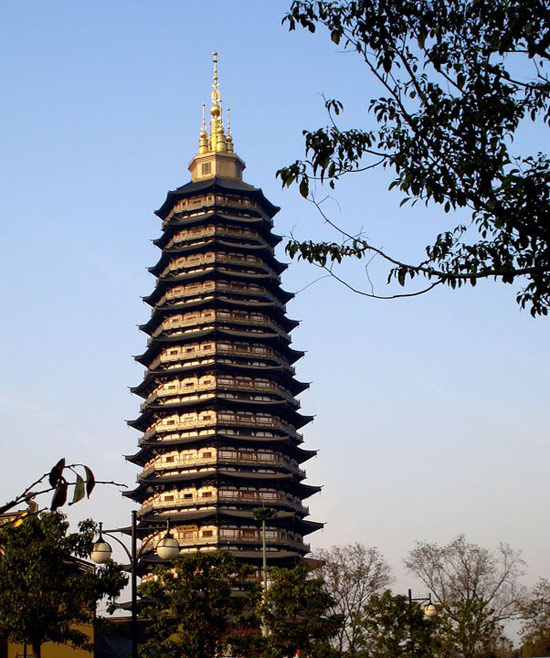 天寧寶塔乃中華第一佛塔(全球最高佛塔)位于江蘇省常州市天寧寺內(nèi)。天寧寶塔始建于2002年4月,于2007年4月30日開光??偨娣e2.7萬平方米,塔高13層153.79米,為國(guó)內(nèi)4000多座寶塔之最;從底層地宮到頂層鐘樓,整座寶塔以佛教文化為主線,以東陽木雕、揚(yáng)州漆器、常州亂針繡、惠安石雕等手工藝術(shù)為表現(xiàn)手法,巧妙地詮釋了大乘佛教的諸多教義。佛塔的建成,與北方云崗大佛、中原龍門大佛、西方樂山大佛、東方靈山大佛、南方香港天壇大佛遙相呼應(yīng),成為五方五佛的佛心。