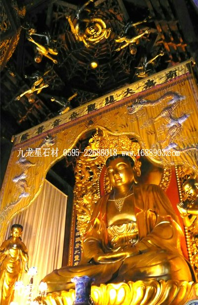 九龍殿:可以說是普陀山上龍文化的集大成之杰作。此殿在清康熙三十八年建成后,世稱“宏制巧構(gòu),甲于東南”,名聞天下。據(jù)史料記載,清康熙四年,普陀山曾遭荷蘭殖民主義者侵占和掠奪,法雨寺殿宇被毀。三十八年經(jīng)康熙恩準(zhǔn),將金陵故宮的琉璃瓦和舊殿九龍藻井拆遷于此,故而此殿的來歷不同凡響。為目前國內(nèi)寺院建筑中規(guī)模最高的一座佛殿,亦是法雨寺的主殿。九龍殿的特點,重檐黃瓦,宏偉深廣,殿頂內(nèi)槽九龍藻井,穹窿成拱形,一龍盤頂,八龍環(huán)繞八根垂柱懸空而下,昂首舞爪,搶抓居中懸掛的琉璃燈,形成九龍搶珠之勢。其造型之生動,工藝之精巧,堪稱普陀一絕。在九龍殿中還有48根柱磉,均為透雕蟠龍,隆鼻斜眼,張發(fā)伸爪,各呈異態(tài),更使九龍殿增添了龍文化的風(fēng)韻和色彩。 也許是九龍殿的名氣太大了,歷代名人或文人所寫的楹聯(lián)、匾額、詩詞頗多,亦可能是歷代名人的眾多作品,因此進一步提高了九龍殿的知名度,或許兩者兼而有之。如新編的《普陀山志》的楹聯(lián)篇中寫九龍殿的就有七條,占法雨寺佛殿之首。其中有菲律賓華僑葉健民、施佩君合家敬獻的“天華降錦屏,九龍殿中騰光輝;法雨潤靈鷲,白華山上顯感應(yīng)”,此為代表作之一。清朝金土奎的詩《法雨寺》中亦有“九龍殿已偕山老,五門對海雄”等吟九龍殿的詩句等等,可見九龍殿影響之大。