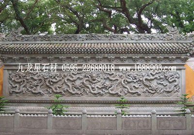九龍壁:在法雨寺天王殿對面照墻處,1988年由溫嶺縣長嶼鎮(zhèn)民間石雕工匠梁宗濤等人用質(zhì)地優(yōu)良的青石板精雕細刻而成。它是仿照北京故宮九龍壁,卻又不同于故宮、大同等地的陶制九龍壁。法雨寺九龍壁是用60塊70厘米見方的優(yōu)質(zhì)青石,精雕細鑿,拼接而成。有的石板上是半個龍頭,有的石板上是一只龍角,有的石板上是一只龍爪,拼接起來竟然不露縫隙,像是在一塊青石上雕刻而成。這不僅有濃厚的刀味,石趣,更顯示了民間雕匠的高超工藝。此座九龍壁高2米,長12米,浮雕凸出16厘米。九條青龍騰飛于云山碧海之間,盤旋翻滾,爭奪龍珠,造型逼真,栩栩如生,富有立體感。而在梁與梁之間還雕有十七條造型各異的小龍,昂首舞爪,十分生動,更使這九龍壁群龍盤舞,似有龍將破壁,呼之欲出之感。此壁于1987年由香港同胞捐建。壁的東側(cè)還立有《新建九龍壁功德碑》,碑文曰:“法雨寺原有照壁,前有石牌檔,以條石和塊石為之?!虻鬲M樹大不相稱,始新建九龍壁,取龍?zhí)鞊碜o之說,且又與九龍殿相對稱,”云云。