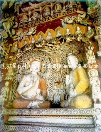 石窟位于山西省大同市西北的武州山北崖上,是我國三大石窟之一,距今已有1500多年的歷史。整個(gè)石窟依山開鑿,東西綿延1公里,現(xiàn)存主要洞窟53個(gè),大小造像51000多個(gè)。石窟雕刻的題材內(nèi)容,基本上是佛像和佛教故事。石窟中最大的佛像是第五窟三世佛的中央坐像,高達(dá)17米。佛像形態(tài)端莊,是中原文化傳統(tǒng)的表現(xiàn)手法,但其臉部形象:額寬、鼻高、眼大而唇薄,卻具有外域佛教文化的某些特征。
