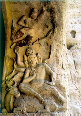 最饒有趣味的是第八窟拱門東側(cè)雕刻的摩醯首羅天和西側(cè)的鴻摩羅天,一個(gè)騎神牛三頭八臂,一個(gè)乘神鳥五頭六臂。這一組新奇神異的浮雕,不再是生命的寫實(shí),而是精神的寫意。游牧民族用審美的藝術(shù)形象折射生命現(xiàn)象中的“多頭多臂”,內(nèi)化為人類幻想生長出更多的智慧頭腦和勇敢的手臂,去征服自然,以獲得自身生命的拓展與延伸。