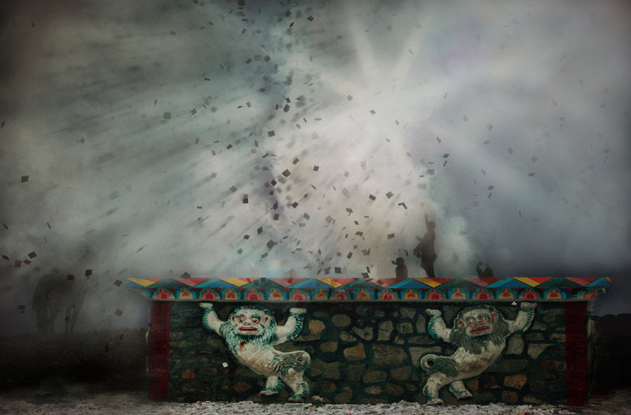 黃俊英---高原祭壇。作品拍攝于2011年甘肅省瑪曲縣阿萬(wàn)倉(cāng)鄉(xiāng),該鄉(xiāng)周圍的山頭上有許多祭壇,是藏民們祭祀時(shí)的神圣之地,祭壇上雕刻精美浮雕畫極具民族特色。