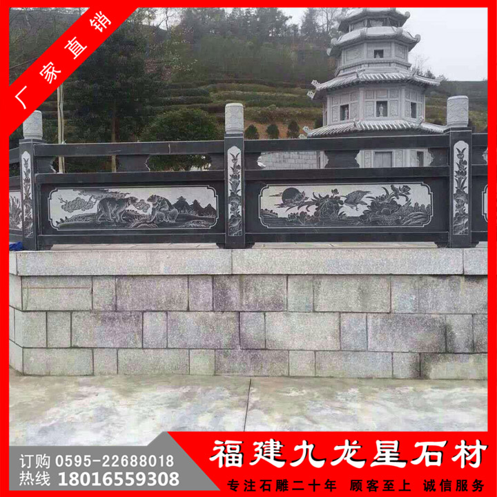 青石石雕欄桿表面色澤均勻,外觀光彩奪目,猶如那湖中的蓮花般出淤泥而不染,在維護(hù)人們安全時(shí)給予人們一種溫馨而美好的意境。青石欄板上的圖案更是各有千秋耀眼奪目,有刻畫著山水情懷,有亭臺樓閣,有圖文并茂,有人魚鳥獸等。在各個(gè)地方展現(xiàn)著不一樣的風(fēng)采。