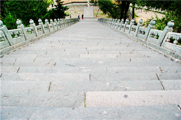 沿著108級臺階一步步往上登,臺階盡頭那座漢白玉牌坊可謂美輪美奐,讓人嘆為觀止。石牌樓四柱三門,上蓋三個(gè)樓頭,分上下兩層,居中的樓頭既高且大,兩個(gè)耳樓頭下傍,四根方柱插入四方礅,每根方柱又有前后兩根圓柱斜頂,結(jié)構(gòu)緊湊而穩(wěn)固。石牌樓形制剛健挺拔,通體精雕細(xì)刻,堪稱石雕建筑藝術(shù)珍寶。中門的拱券上雕有二龍戲珠,兩條龍飛騰在團(tuán)團(tuán)白云之中,張著大嘴,睜著圓目,很有氣勢。龍頭、龍角、龍牙、龍舌、龍須、龍鱗、龍爪和云頭等,雕得恰到好年,富有質(zhì)感,雕工紛繁而脈絡(luò)清晰。中門橫伏間的嵌板上題有“佛光普照”。