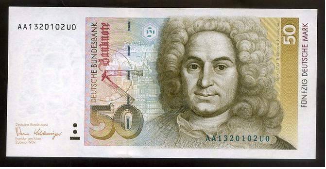 諾依曼是18世紀巴洛克建筑師,他的肖像和最杰出的作品之一,奢華的維爾茨堡住宅,于1991-2002年間一起出現(xiàn)在德國50歐的紙幣上。