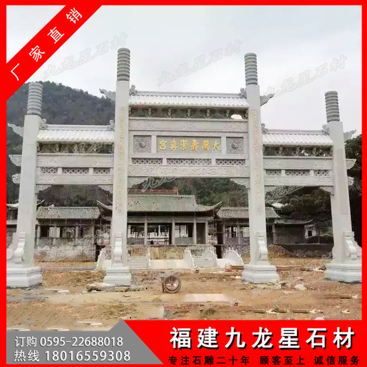 第二:牌坊大小,大型牌坊也有大小之分,筆者見過最大的牌坊高達(dá)6米,左右寬12米,深3米,整座牌坊完全采用立柱搭建,造型別致,精妙絕倫,這樣的大型牌坊價(jià)格是非常高的,當(dāng)時(shí)聽聞,需要幾千萬制作而成。但是普通的三門牌坊也可以稱之為大型牌坊,價(jià)格不過幾萬到十幾萬也非常多。主要是越大的作品,需要加工的工藝和使用的石料都會(huì)增加,并且后續(xù)的運(yùn)輸,安裝也會(huì)非常的繁瑣導(dǎo)致的。