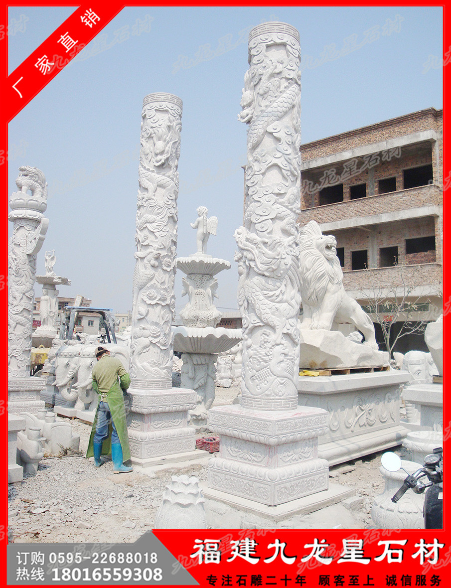 二、石雕龍柱現(xiàn)貨制作廠家常用石材介紹石雕龍柱由多種工藝制作,圓雕石雕龍柱,透雕石雕龍柱,線雕石雕龍柱,平雕石雕龍柱,浮雕石雕龍柱,畫雕石雕龍柱,影雕石雕龍柱等工藝。石雕龍柱外形有圓柱石雕龍柱和棱形石雕龍柱。石雕龍柱可用多種石料雕刻而成,常用:花崗巖石雕龍柱(青石石雕龍柱,白麻石雕領(lǐng)證,銹石石雕龍柱等),大理石石雕龍柱(漢白玉石雕龍柱、晚霞紅石雕龍柱),也可用玉質(zhì)石料雕刻,天青墨玉石雕龍柱、霞玉石雕龍柱、緬甸玉石雕龍柱等。