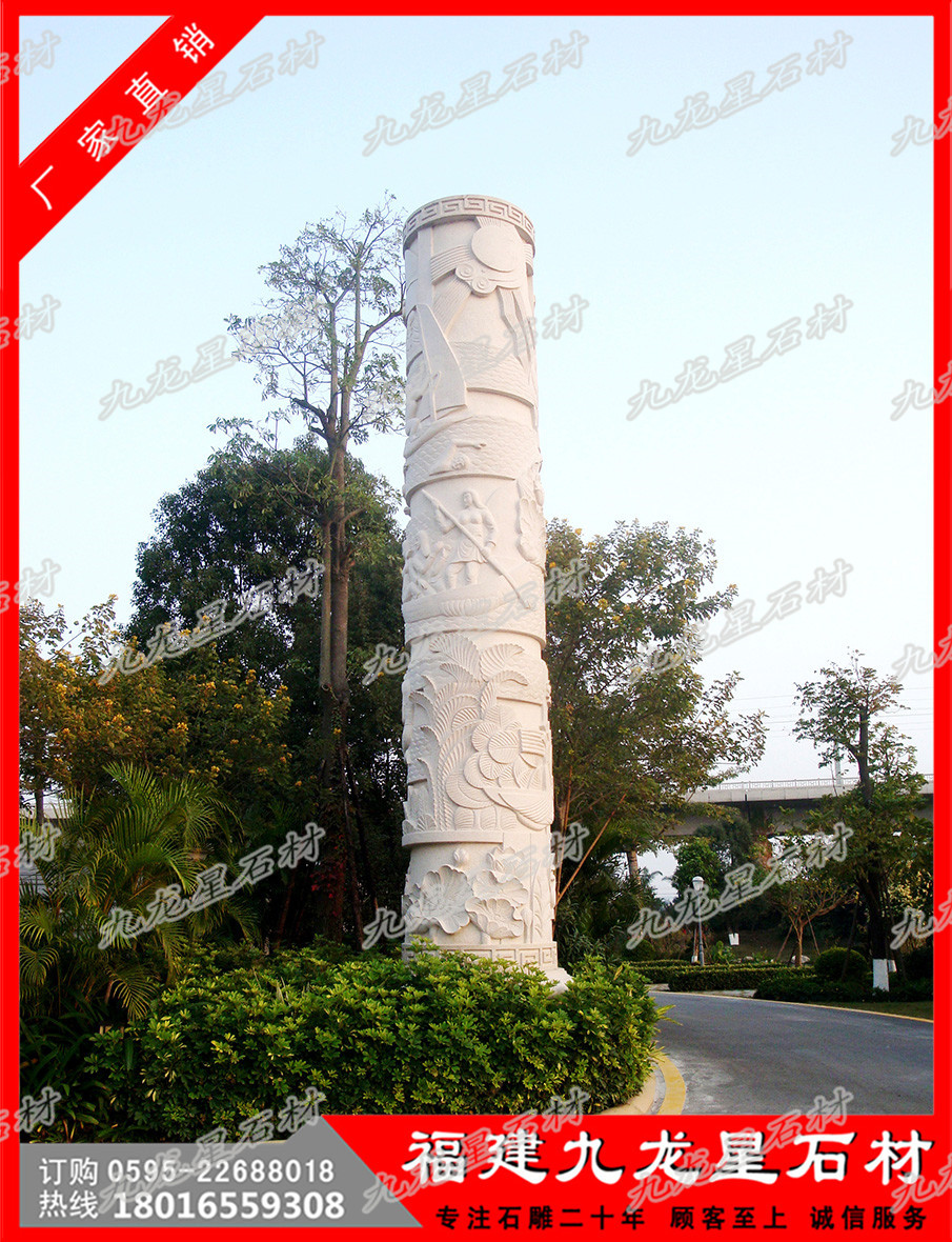我國(guó)的廣場(chǎng)景觀文化柱子石雕除了具有圖騰性質(zhì)和紀(jì)念性的華表、墓表之外還有許多寺廟中宣揚(yáng)宗教教義、經(jīng)文的文化柱,到了近現(xiàn)代文化柱除了紀(jì)念性之外更多的作為宣傳歷史文化、民族文化、傳統(tǒng)文化等的載體而出現(xiàn)。比如曾作為2009年中華人民共和國(guó)建國(guó)60周年國(guó)慶的慶典背景之一的民族團(tuán)結(jié)柱就是紀(jì)念性和文化性的綜合體。它們的紀(jì)念性體現(xiàn)在:民族團(tuán)結(jié)柱共五十六根,象征五十六個(gè)民族,整體色調(diào)為中國(guó)紅和金黃色,柱頭柱礎(chǔ)為蓮花紋飾和卷草紋的結(jié)合與人民大會(huì)堂的門柱圖案元素一致,相互呼應(yīng)。寓意56個(gè)民族團(tuán)結(jié)在黨中央周圍,建立民主政權(quán),共同享有民主權(quán)利,柱身為各民族吉祥紋樣以及載歌載舞的場(chǎng)景,體現(xiàn)人民歡慶建國(guó)60周年的喜悅之情。他們的文化性體現(xiàn)在:每根文化柱上都雕刻著一個(gè)民族的文化符號(hào),包含每個(gè)民族特有的文化元素和文化符號(hào),很好的展現(xiàn)了每個(gè)民族的文化特色。