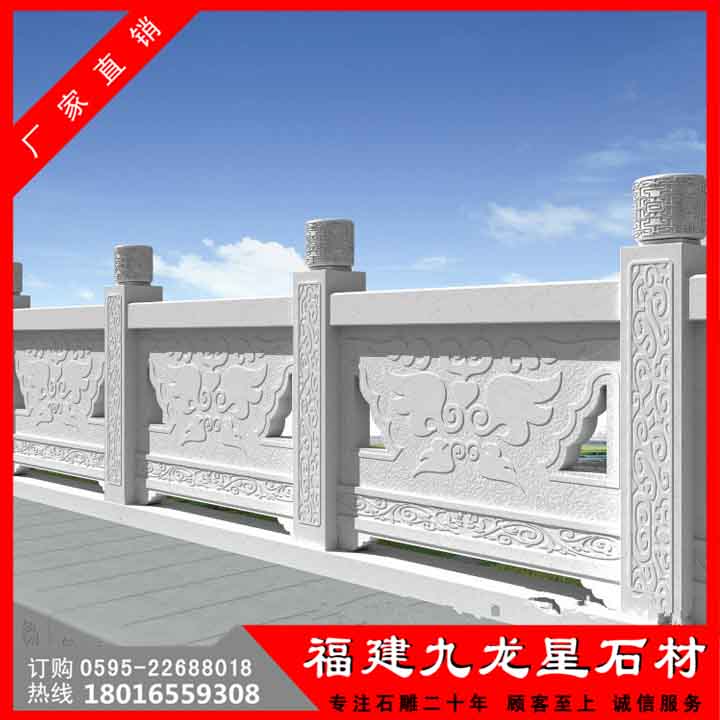 石雕欄桿是橋梁或建筑上的安全防護(hù)設(shè)施,欄桿不但要求堅(jiān)固,起到一定的防護(hù)作用,而其還要注意美觀,起到美化建筑的作用。石雕欄桿優(yōu)點(diǎn)很多,最重要的是容易清洗,看起來高端大氣,質(zhì)量也好,并且給人非常充實(shí)的感覺。而實(shí)用性上,石材的欄桿可以使用更長的年限,且結(jié)實(shí)牢固,安全性上面也是有保障的。石雕欄桿有著美觀、時(shí)尚、環(huán)保、抗老化、不變形的性能優(yōu)點(diǎn),可廣泛用于市政、水利、公園、橋梁欄桿等護(hù)欄工程。