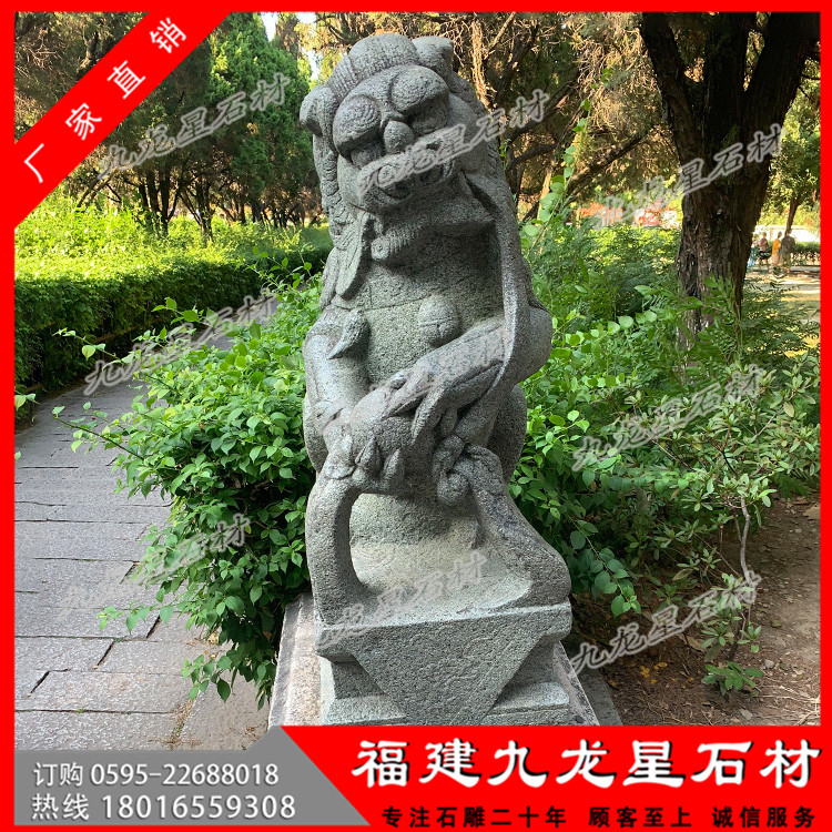 石雕獅子大體是漢族傳統(tǒng)文化中常見的辟邪物品之一。宮廷石獅一般置于宮殿、陵墓前,在形體力度和內在精神氣勢上氣吞山河、威猛雄壯;宗教石獅多出現(xiàn)于佛教寺廟石窟之中,其形象對之后中國石獅造型的演變產生很大影響;民間石獅最普及也最有生命力,百姓把獅子看成能驅惡辟邪的瑞獸,因此,在民間數量最多的是牌坊門墩獅和鎮(zhèn)宅獅,此外,還有拴娃獅、壓繃獅、印紐獅等等。造型的隨意性和夸張性是民間獅子形象的一個突出點,格調清新,情趣盎然,并運用象征、會意、諧音等手法來創(chuàng)作石獅形象,賦予了喜慶吉祥色彩,充滿著濃郁的生活氣息。